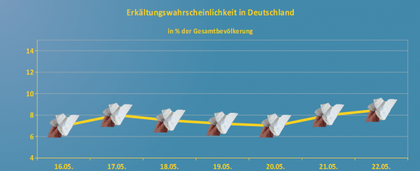 Statt warmer Maiwonne wie in der letzten Woche gibt es nun wieder feuchte Nasen: Das Schnupfen- und Gripperisiko steigt, wenn auch moderat, wieder etwas an.