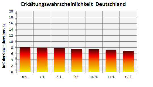 Bewegen sich die Erkältungs- und Grippezahlen zu Wochenbeginn noch rund um die 8%-Marke, sind zum Ende der Woche nämlich nur noch etwa 7% der Bevölkerung grippe- und erkältungsgeplagt.