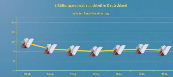 In diesem Jahr zeigt sich der 11. Monat aber zunächst noch von seiner milden und trockenen Seite. Die Wahrscheinlichkeit, sich nun eine Erkältung oder Grippe einzufangen, liegt momentan bei unter 10 %. Gute Werte für einen eigentlich trüben Monat.