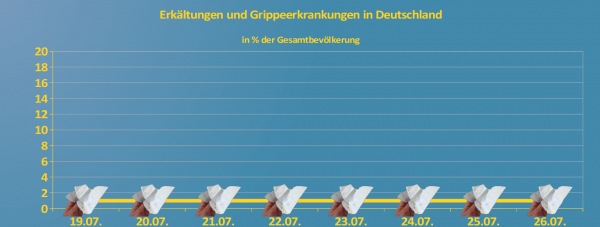 Die sommerlichen bis hochsommerlichen Temperaturen Wochenhälfte sind gut zu uns Menschen, weniger gut jedoch zu Grippe- und Erkältungsviren: Nur durchschnittlich ein Prozent der Bevölkerung schlagen sich aktuell mit einer Erkältungs- oder Grippeerkrankung herum.