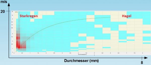 Durchmesser und Geschwindigkeit der Niederschlagspartikel (Häufigkeitsverteilung)