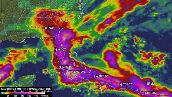 Zum Vergleich die Regenmengen, die Irma hinterlassen hat (NOAA-Daten und Bild). Die gleichen Gebiete in der Karibik sind wieder betroffen.