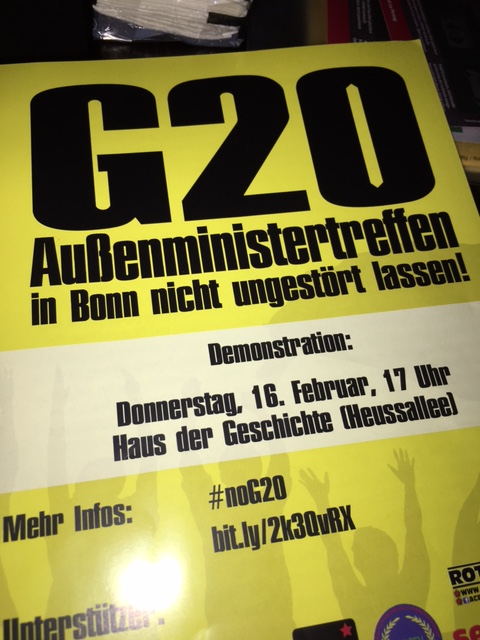 Ein deutliches Zeichen soll am 2. Juli vor dem G20- Gipfel in Hamburg mit einem Aktionstag gesetzt werden. Ein Zeichen gegen die zunehmende Unterdrückung durch das kapitalistische System. Auch gegen das Treffen Mitte des Monats wird es Protestaktionen von Seiten des Netzwerkes Friedenskooperative und der Bonner Jugendbewegung geben. Start der Demonstration ist am Donnerstag, 16. Februar, um 17 Uhr. Die Teilnehmer wollen sich am Haus der Geschichte treffen und von dort zum Kongresszentrum gehen.
