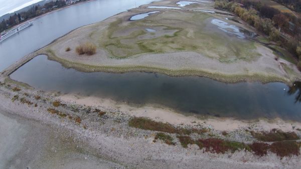 Die Fotos aus dieser Woche lassen den Rhein noch als breites Band erscheinen; mit einem genaueren Blick auf die Ufer fallen aber die Schotterflächen an den Rändern auf.