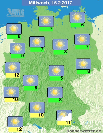 Große Temperaturgegensätze kennzeichneten den Tagesgang dann am Mittwoch (15.02.). Nach Tiefsttemperaturen teilweise um -8 Grad C, heizte sich die Luft dank der bereits schon kräftigen Februarsonne bis zum Nachmittag auf vorfrühlingshafte 10 bis 16 Grad C auf. In Geilenkirchen (NRW) wurden sogar 17,8 Grad C gemessen. Der Himmel über Deutschland war vielerorts wolkenlos, oder nur leicht bewölkt. Lediglich am Bodensee blieb es bis über Mittag neblig-trüb.