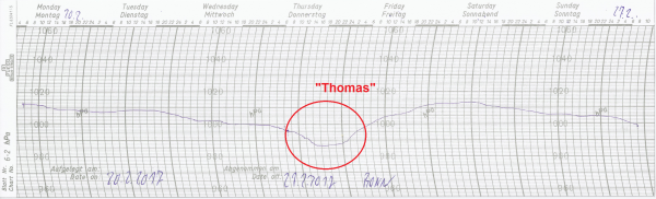 Ausgerechnet an Weiberdonnerstag (23.02.) gab es dann sehr turbulentes Wetter in Deutschland: Orkantief „Thomas“ zog von den Britischen Inseln nach Schleswig-Holstein. Es trieb neben orkanartigen Böen von zum Teil über 100 km/h, die vor allem im Westen sowie über der Mitte erreicht wurden und einige Schäden hinterließen, auch Regenwolken vor sich her. Auf dem Brocken im Harz gab es Windgeschwindigkeiten von bis zu 156 km/h.