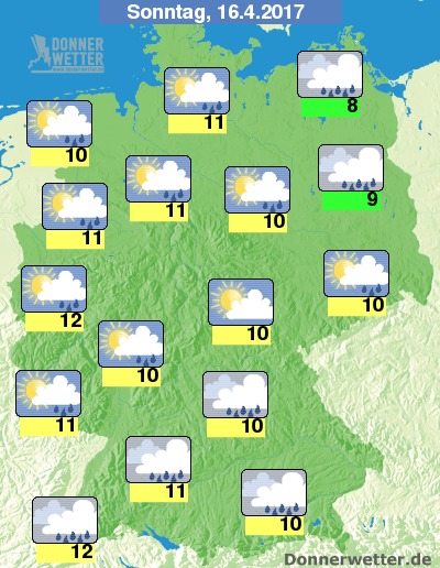Der Wochenstart (10.04.) zeigt sich in Deutschland dann zweigeteilt. In der Nordwesthälfte dominierten die Wolken und die Temperaturen lagen meist nur noch zwischen 10 und 17 Grad C. In der Südosthälfte schien lange Zeit die Sonne und heizte die Luft nochmals auf warme 18 bis 26 Grad C. Im Laufe des Nachmittags und Abends entwickelten sich im Süden teils kräftige gewittrige Regengüsse.