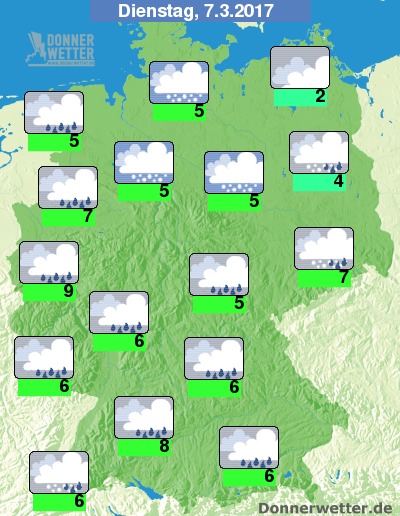 An den Alpen stauten sich am Dienstag (07.03.) die Wolken. Dabei fiel bei Temperaturen zwischen 0 und 3 Grad C zum Teil bis unter 800 m Schnee. Im Norden blieb es den ganzen Tag über trübe und mit 3 bis 5 Grad C auch ziemlich kühl. Dazwischen gab es eine breite Zone, in der sich kurze sonnige Momente mit zahlreichen Schauerwolken abwechselten. Zum Teil mischten sich Graupelkörner unter den Regen. Auf den Bergen schneite es teilweise. Die Temperaturen erreichten 5 bis 10 Grad C.