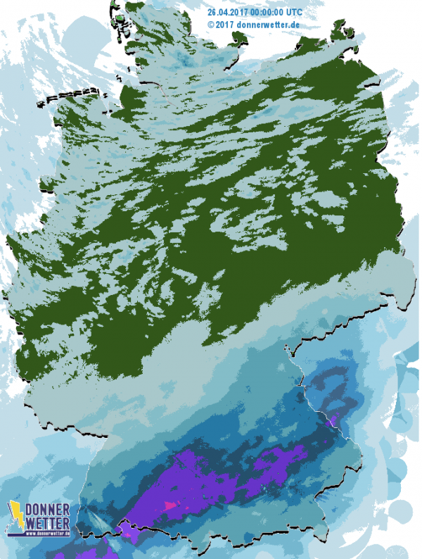 Im Süden fiel am Donnerstag (27.04.) je nach Höhenlage zum Teil andauernder Regen und Schnee. Sonst wechselten sich längere sonnige Abschnitte mit einigen Schauerwolken ab. Die Temperaturen erreichten 10 bis 15 Grad C. Bei Dauerniederschlag blieb es jedoch spürbar kühler.