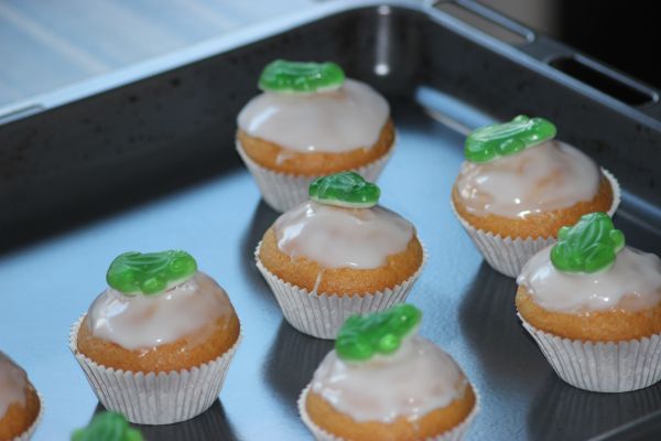 Sind die Törtchen aufgegangen aus dem Backofen holen und abkühlen lassen. Dann Puderzucker und Zitronensaft für die Glasur mischen und dick auf die Muffins auftragen. Jedem Törtchen auf die feuchte Glasur einen Gummifrosch setzen.