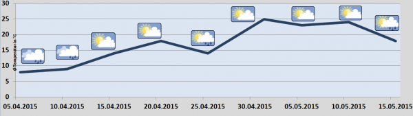 Erst zum Ende des Monat könnte, nach jetzigen Berechnungen unserer Modelle, das Quecksilber bei heiterem Hochdruckwetter kurzzeitig an der magischen 25-Grad-Marke kratzen.