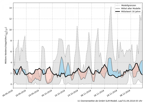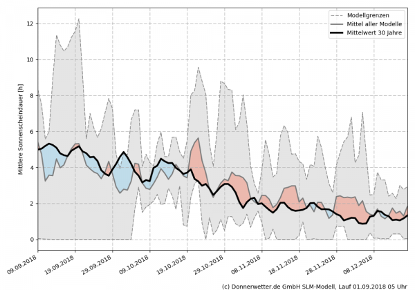 Leider erwartet uns in den kommenden Tagen eine Durchschnittstemperatur von nur 15 Grad und weniger. Doch lasst euch davon nicht beunruhigen, denn die Nächte zählen dazu und auch heute ging das Thermostat schnell mal unter 10 Grad C. Der September wird hinsichtlich der Grafiken recht trocken ausfallen aber bedeckt.