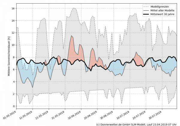 Die kommenden Wochen verlaufen laut aktueller Modellrechnungen im Norden zu kühl und zu trocken. Die Anzahl der zu erwartenden Sonnenstunden liegt bis Ende kommenden Monats mal über, mal unter dem langjährigen Mittel.
