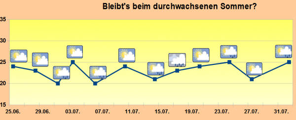Im Juli halten sich dann freundliche und Schauerphasen die Waage. Die Temperaturen erreichen dabei allenfalls sommerliches Nivau - heiße Tage mit Temperaturen von 30 Grad C und mehr sind eher unwahrscheinlich.