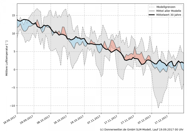 Heute wollen wir uns einmal den zweiten Hälften unserer Prognosegrafiken widmen. Denn auch wenn die meisten noch einem schönen Altweibersommer und Herbst entgegenfiebern, ist der Winter auch nicht mehr weit. Und der könnte in diesem Jahr den Herstellern von warmer Unterwäsche zu einem kräftigen Umsatzplus verhelfen - der Dezember und möglicherweise auch Januar kommen im Osten deutlich zu kühl daher. Stabile Hochdrucklagen über Osteuropa bringen jedoch auch immer wieder freundliche und trockene Phasen.