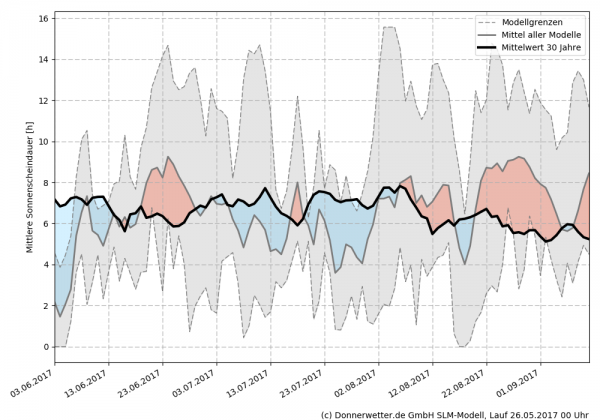 Weiterhin sieht es danach aus, als dass der Norden auf einen insgesamt unterkühlten Sommer zusteuert. Überdurchschnittlich warm verläuft dagegen der Start in den September. In diesem Zeitraum sind in den kommenden 100 Tagen auch die markantesten Zuwächse bei den Sonnenstunden zu verbuchen. Insgesamt gehen wir im Norden von einem zu trockenen Sommer aus.