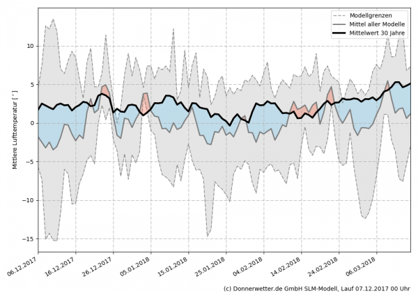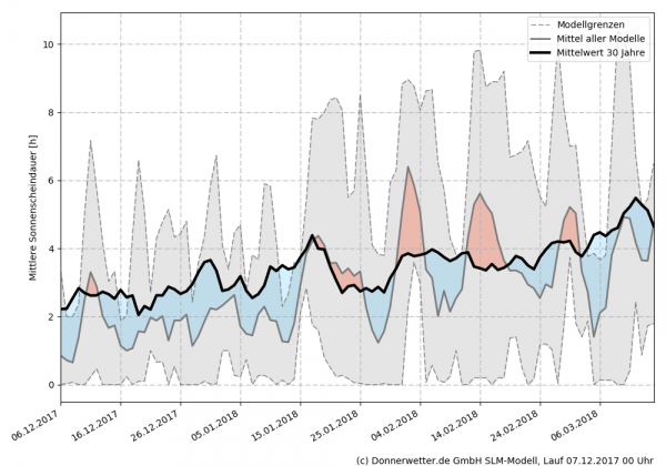 Die Farbe Blau dominiert in den aktuellen Prognosegrafiken für den Süden des Landes und symbolisiert einen sehr winterlichen Wetterverlauf in den nächsten Wochen. Sowohl die aktuell berechneten mittleren Lufttemperturen als auch die Sonnenscheindauer liegen zum Teil deutlich unter dem Durchschnitt. Positiv verläuft dagegen die Niederschlagsbilanz. Die Schneeschaufel sollte also in Griffweite stehen.