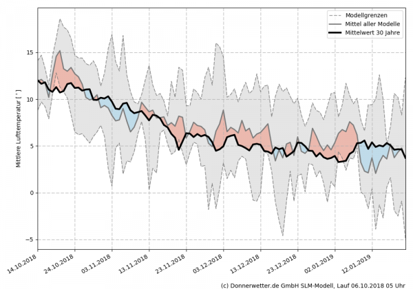 Den mittleren Lufttemperaturen gelingen in den kommenden Wochen im Norden zwar kleine Sprünge nach oben , die Anzahl der berechneten Sonnenstunden hingegen zeigen eine Schwachstelle bis zur letzten Woche im Oktober. Die Tagesniederschlagssummen bewegen sich bis zu diesem Zeitpunkt auch bei überdurchschnittlichen Werten.