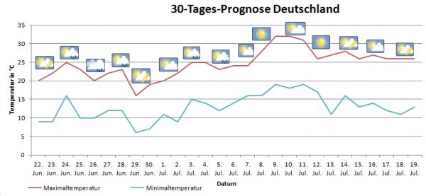 Der Übergang in den Juli sieht nach jetzigen Berechungen eher kühl aus, im Monatsverlauf steigt dann mit den Temperaturen auch die Gewittergefahr wieder an. So gibt es in diesem im Durchschnitt leicht zu warmen Juli von allem etwas: Etwas kühlere Phasen mit Schauern sind ebenso dabei wie sonnig-freundliche und trockene Phasen.