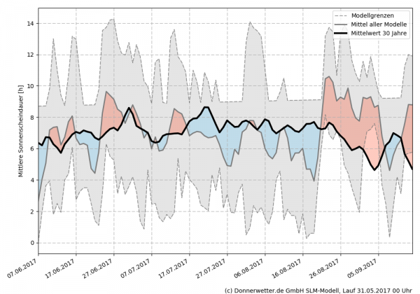 Im Süden bewegen sich die mittleren Lufttemperaturen bis Ende August meist unter den langjährigen Mittelwerten. Bei Niederschlag deutet sich nach aktuellsten Modellberechnungen eine Trendwende an, liegt die mittelere Niederschlagshöhe nun größtenteils über dem 30-Jahres-Mittel. Bei der Sonnenscheindauer gibt es ein stetiges Auf und Ab, am sonnigsten wird es vorraussichtlich im Spätsommer und Frühherbst.