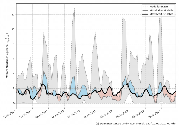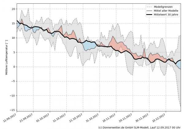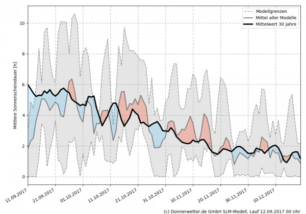 Zumindest im September gelingen dem Altweibersommer im Osten keine großen Sprünge mehr. In den Wochen danach berechnet unser aktuelles Langfristmodell zeitweise zu milde Temperaturen, vor allem der Zeitraum Mitte November bis Mitte Dezember sticht hier heraus. In den letzten beiden Dekaden von Oktober und November gibt es zudem mehr Sonnenstunden als üblich.