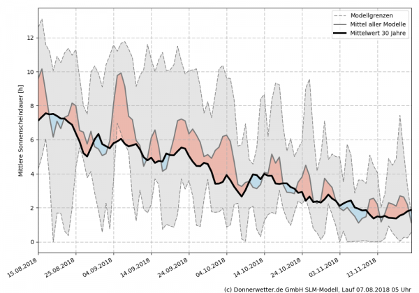 Der Blick auf unsere Grafiken zeigt: Die aktuellen Langfristmodelle gehen im Westen auch in den kommenden Wochen von überdurchschnittlich warmen Temperaturen und deutlich über dem langjährigen Mittel liegenden Anzahl an Sonnenstunden aus. Die Trockenheit wird uns weiter begleiten, dennoch steigt das Schauerrisiko im weiteren Verlauf des Spätsommers phasenweise an.