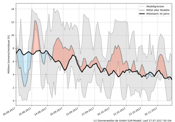 Dem Süden stehen wechselhafte Wochen bevor. Bis Anfang November, so weit berechnet unser Prognosemodell zur Zeit, kündigen sich viele feuchte Tage an. Dennoch macht sich zwischendurch auch immer wieder die Sonne bemerkbar und die mittleren Lufttemperaturen liegen vor allem ab Mitte September zum Teil deutlich über den langjährigen Mittelwerten.