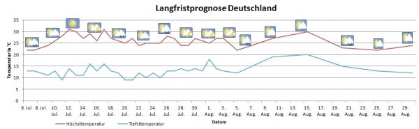 Bis Ende Juli bleiben die Temperaturen teilweise noch auf heißem Niveau, die Abkühlung um den Übergang Juli / August bringt dann aber vermehrt Schauer und Gewitter mit sich. Im August gibt es dann viel Sonnenschein, heiß ist es dabei aber nur bedingt.