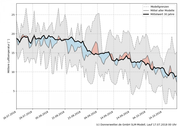 Der südliche Teil Deutschlands hält die 20 Grad C Durchschnittstemperatur nur noch schwer. Eine insgesamt kühlere und wechselhaftere Wetterphase kündigt sich in den nächsten Wochen an, die Sonne ist dann nur noch zeitweise zu Gast.