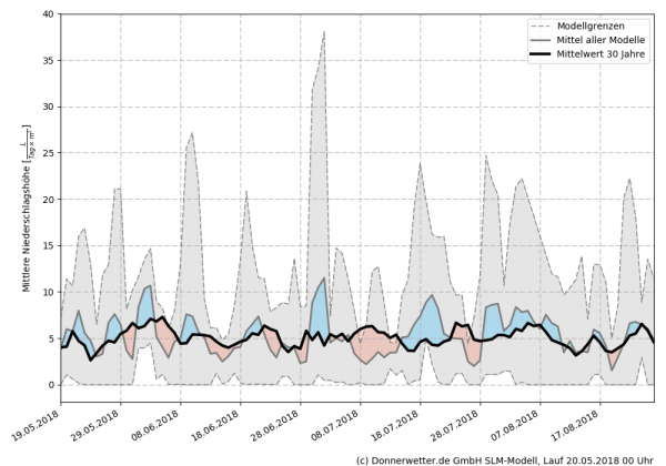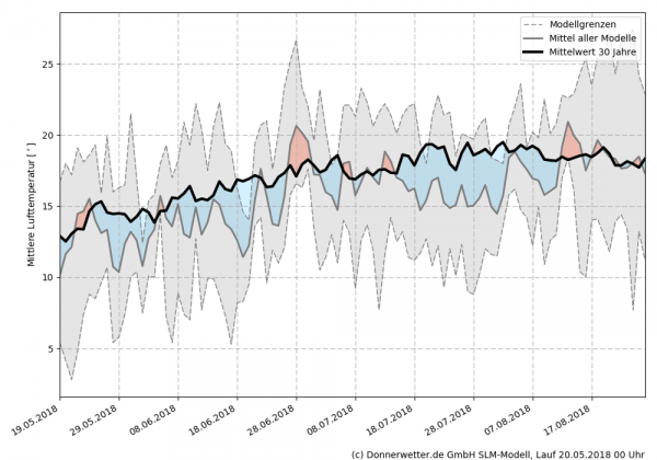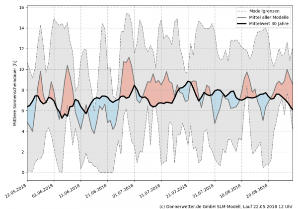 Nach einem sehr warmen und sonnigen April und Mai könnte es um den kompletten noch anstehenden Sommer 2018 laut aktueller Modellrechnungen weniger gut aussehen. Die zu erwartenden Mitteltemperaturen bewegen sich meist unter dem Schnitt, immerhin gibt es vor allem im Juli viele sonnige Phasen.