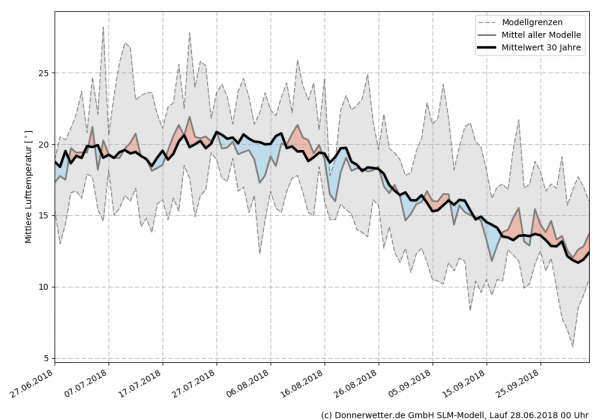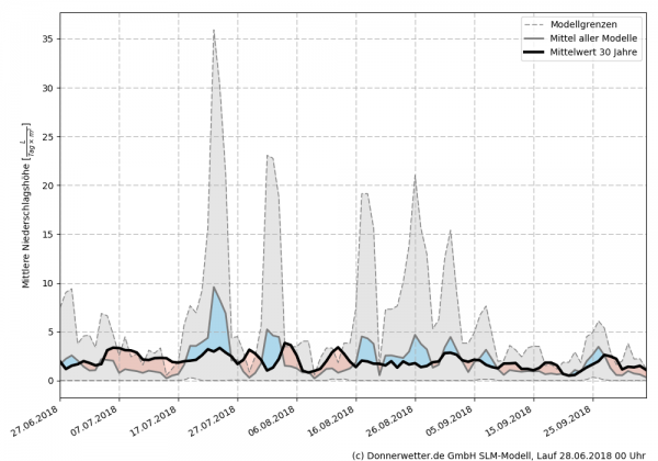 Der Osten kann sich laut aktueller Modellrechnungen in den nächsten Wochen auf insgesamt leicht zu milde Lufttemperaturen einstellen. Bis Mitte Juli liegen die zu erwartenden Niederschlagssummen zudem unter dem Durchschnitt, die Sonne macht sich über weite Strecken rar.