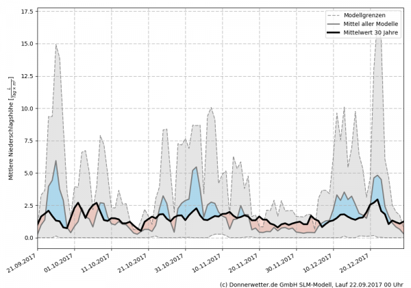 Die nächsten Wochen bringen dem Westen allenfalls durchschnittliches Herbstwetter - die mittleren Lufttemperaturen liegen meist unter dem langjährigen Durchschnitt, im Oktober sowie zwischen der letzten November- und ersten Dezemberdekade gibt es aber auch immer wieder längere trockene Phasen. Die höchste mittlere Sonnenscheindauer dürfen wir nach aktuellem Stand in der zweiten Oktoberhälfte erwarten.