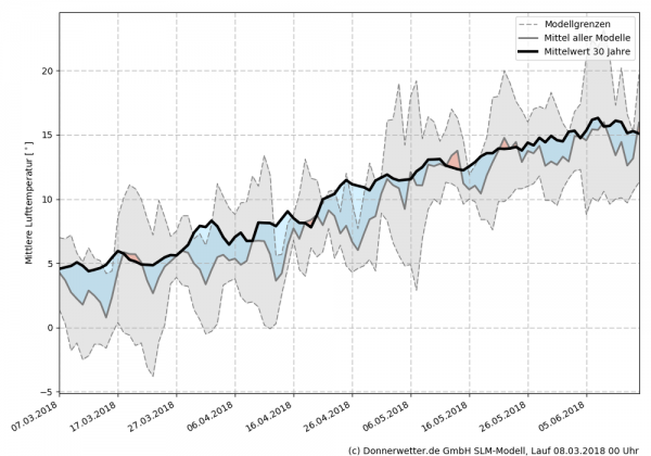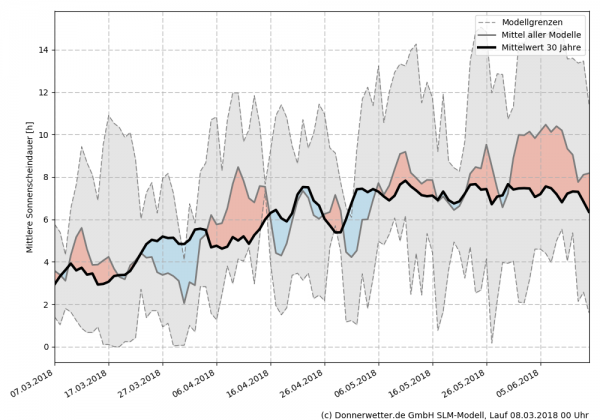Nach einer zu kalten Wetterphase erreichen die zu erwartenden Mitteltemperaturen laut aktueller Berechnungen ab der letzten Monatsdekade wieder überdurchschnittliche Werte. Ein hoher anstgieg der Sonnenstunden ist ab Ende März zu rechnen.
