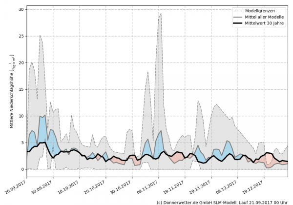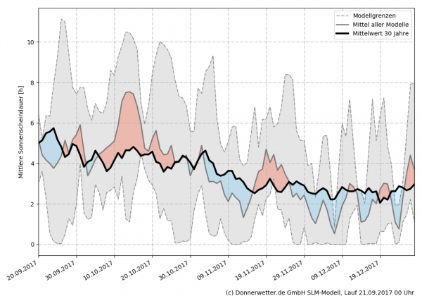Relativ unspektakülar, Temperaturen und Niederschlagsmengen betreffend, geht der Süden des Landes die neue Jahreszeit an. Vor allem im neuen Monat liegen die mittleren Lufttemperaturen tendenziell etwas über dem Durchschnitt. Grund zur Freude dürfte aber vor allem der Blick auf die dritte Grafik auslösen: Nach aktuellem Stand der Berechungen begleiten uns über weite Teile des Oktobers viele sonnige Phasen.