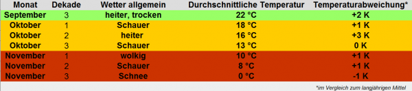 Die Computermodelle zeigen das überdeutlich; in 8 von 10 Berechnungsläufen bleiben September, Oktober, und zum Teil auch der November, zu mild - wobei die Novemberprognose am unsichersten ist.