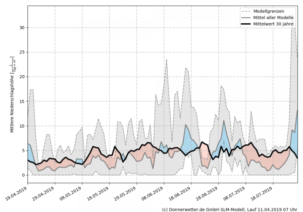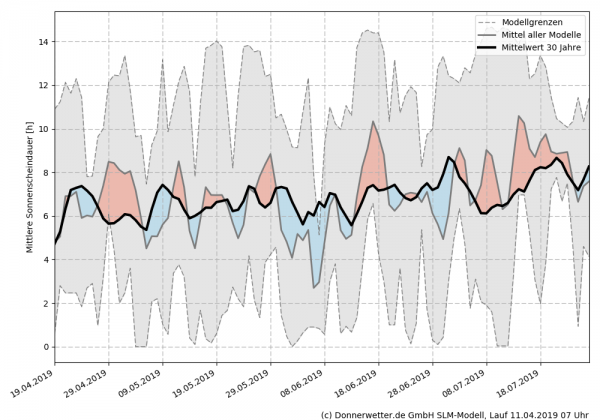 Die kommenden Wochen verlaufen laut aktueller Modellrechnungen im Süden zu kühl und zu trocken. Die Anzahl der zu erwartenden Sonnenstunden liegt bis Ende kommenden Monats mal über, mal unter dem langjährigen Mittel.