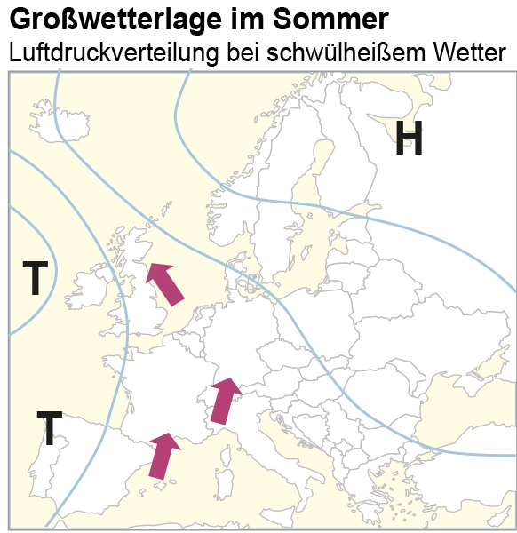 Die klassische Hitzewetterlage, wie im Juni, sieht so aus: