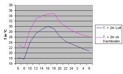 Luft draußen. Auch nachts sind die Werte noch um 4°C höher, was auf die Dachpfannen zurückzuführen ist, die sich nachmittags auf bis zu 60°C erwärmen können.