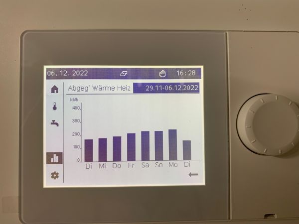 Das Bild zeigt die erzeugte Wärmemenge für die Büroflächen der donnerwetter.de GmbH in Bonn der letzten Tage. Mit den sinkenden Temperaturen wurde mehr Energie bereitgestellt, um die 18 bis 20 Grad Innenraumtemperatur erreichen zu können.