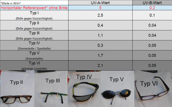 Unter der Tabelle sehen Sie die verschiedenen fünf Brillentypen, die wir getestet haben. Von einer Sonnenbrille (Typ V), über eine Sportbrille (Typ IV), einer günstigen Lesebrille (Typ VI) und einer teuren, selbsttönenden Brille (Typ I) ist alles dabei. Neben den aufgelisteten Typen sehen Sie die UV-A und UV-B-Werte in Watt pro Quadratmeter, die die entsprechenden Brillentypen durchgelassen haben. Die rot markierten Werte, geben die Referenzwerte ohne Brille an.