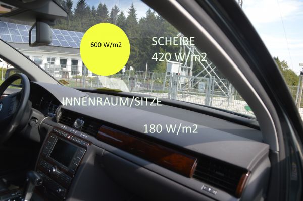 Auf unserem Bild oben scheint die Sonne mit einer Leistung von 600 W/m². Davon kommen im Innnenraum - je nach Modell - bei einfachen Scheiben 300-400 W/m² an. Entsprechend heiß wird es dann für die Insassen.