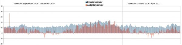 Die Abbildung zeigt die Innnenraumtemperatur der Ausstellunghalle zwischebn September 2015 und April 2017. Bis September 2016 gab es keine solare Lüftung: