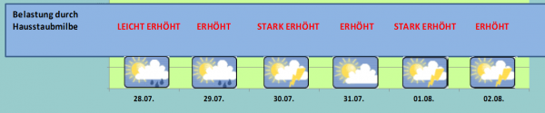 Bei solch fast schon tropischen Verhältnissen sind natürlich auch die Milben nicht weit - bei zeitweiligen Schauer und Gewittern erreichen die Hausstaubbelastungen am Wochenende und über weite Teile der neuen Woche teils stark erhöhte Werte.