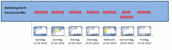 Die Temperaturen erreichen bei hoher Luftfeuchtigkeit teilweise bis zu 10 Grad C. Ab der Wochenmitte wird es wieder etwas kälter und die Luft trockener. Damit sinkt die Belastung durch den Milbenkot in den Innenräumen.