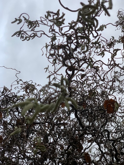 Die Pollen der Korkenzieherhasel, welche auf unserem Bild zu sehen ist, starten ein wenig später als die der Gemeinen Hasel. Mit den ersten "Korkenzieherpollen" ist voraussichtlich erst im kommenden Monat zu rechnen.