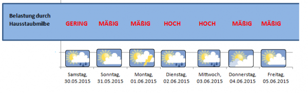 In der kommenden Woche wird sich dieser Zustand mit steigenden Temperaturen allerdings ein wenig ändern: Feucht-warme Luft ist am Montag und Dienstag wetterbestimmend, damit steigt dann auch das Risiko einer Hausstauballergie.