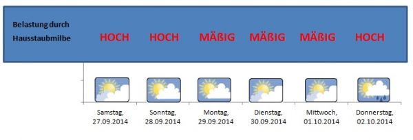 Ohne Entfeuchtung im Haus sind niedrige Luftfeuchtigkeiten bei der aktuellen Wetterlage nicht zu erreichen. Die Luftfeuchtigkeit wird vorerst bei rund 65 - 80 %  verbleiben. Die Belastungen durch Milben sind daher mäßig bis stark.
