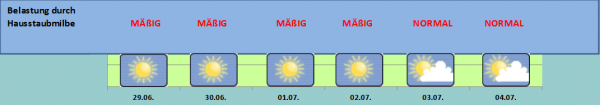 Die Außenluftfeuchtigkeit ist sehr gering und somit sinkt auch die Belastungen durch Hausstaub. Das wird wohl vielen Allergikern zu gute kommen, denn das setzt sich auch in der neuen Woche fort. Strahlende Sonne mit sehr warmen Temperaturen.