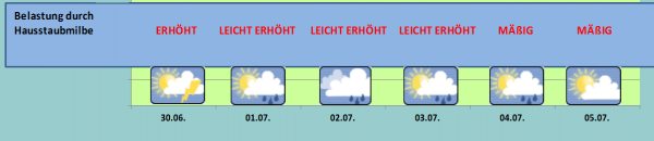 Bei mäßig warmen Temperaturen sind auch in den kommenden Tagen in weiten Landesteilen immer wieder Schauer und Gewitter zu erwarten. Hausstaubmilben findet somit ein für sie perfektes Klima vor, die Hausstaubrisiken sind am Wochenende und in der neuen Woche als mäßig bis stark einzustufen.