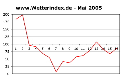 So wird schnell deutlich, dass der Mai 2005 mit Indexwerten um 190 Punkten sehr warm und sonnig startete, bevor der Index ab dem 3. Mai unter die 100-Punkte-Marke fiel, am 7. Mai sogar unter 20 Punke sackte. Erst am 13. Mai konnte der Index wieder die 100-Punkte überschreiten, seitdem herrscht eher durchschnittliches Wetter.